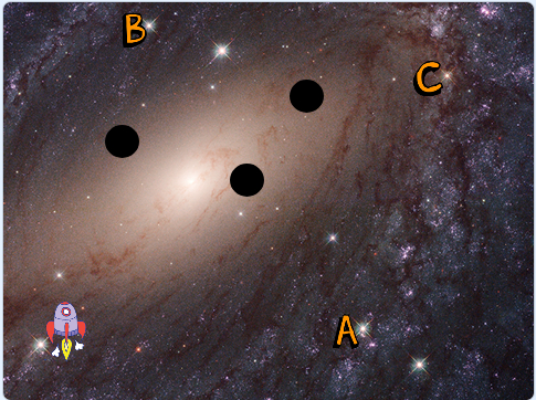 货运飞船要将货物运到A、B、C三个基地,途中会遇到三块太空垃圾。宇航员要控制飞船避开太空垃圾,否则飞船会被太空垃圾撞毁。