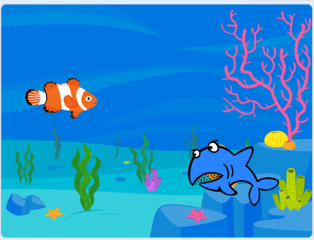 (4)当Shark2碰到Fish时,会张嘴闭嘴一次,这时Fish会隐藏被“吃掉”,一秒后Fish会重新在随机位置出现。