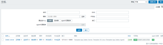 添加后稍等片刻就可以看到新建的主机成功,添加的模板等都可以看到。下面Zabbix server是zabbix服务器本机,本机也是可以被监控的(自己监控自己)。