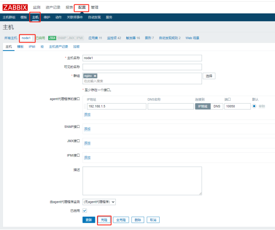 配置→主机→创建主机→选择两个模板→添加→添加