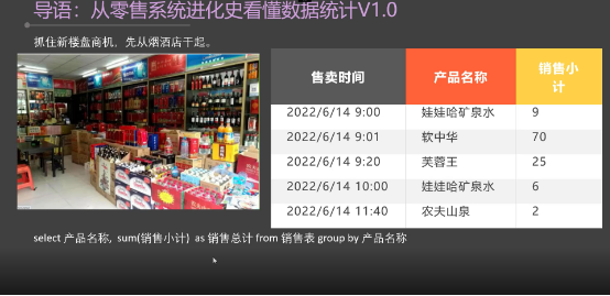 只需要获取当日累计的销售额,于是店老板就用 Excel或者纸质的表格创建了一个表,表中包含销售的日期时间,销售的产品,销售的数量,以及卖出的单价是多少。如此每天进行一个汇总,或者月底进行汇总就可以知道当天或当月的销售额是什么情况了。