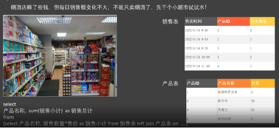 select产品名称, sum(销售小计) as 销售总计from(select \*,销售数量\*售价as 销售小计from 销售表left join 产品表on ... )tmpgroup by 产品名称
