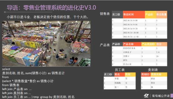 随着商店销售业绩额的增长,销售品类的增多,无法用单一的表格进行统计和记录,因此老板需要新增数据表,如产品表,销售表,来分析每个产品的库存量,销量,以及哪个时间比较销量比较好,因此可以动态增加库存来保证货源的充足,需要更进一步的数据分析。
