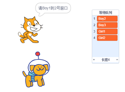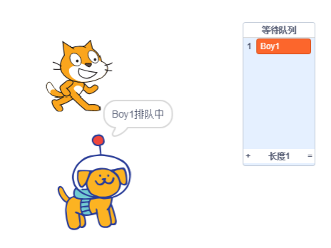 (2)第一次按下B键,“Boy1”添加到“等待列表中”,角色Dot说:“Boy1排队中”;第二次按下B键,“Boy2”添加到“等待列表中”,角色Dot说:“Boy2排队中”;以此类推;