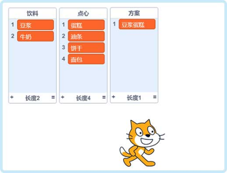 (1)点击绿旗,两种饮料会被添加到列表“饮料”中,四种点心会被添加到列表“点心”中;