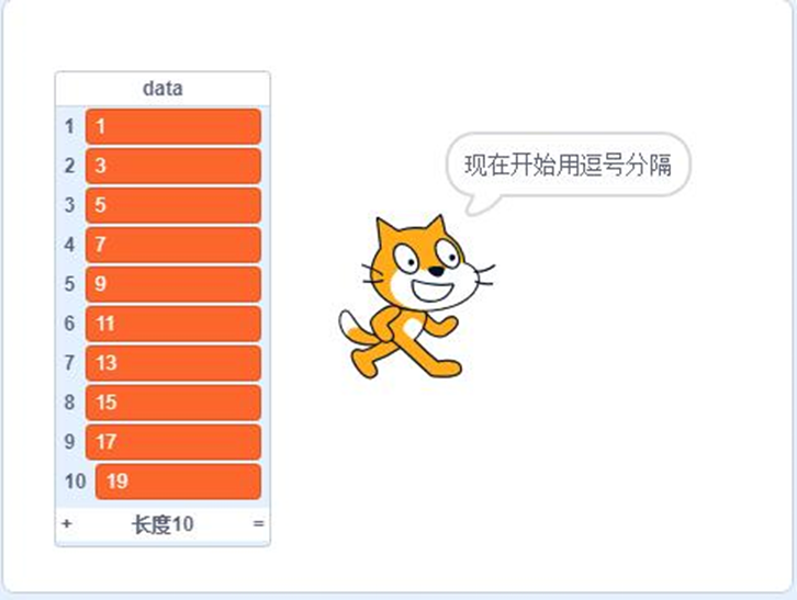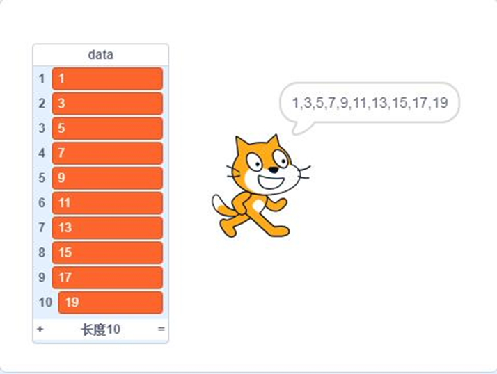 在列表中自动添加10个数字,分别是:1 3 5 7 9 11 13 15 17 19,用逗号分隔列表,让小猫说出结果。