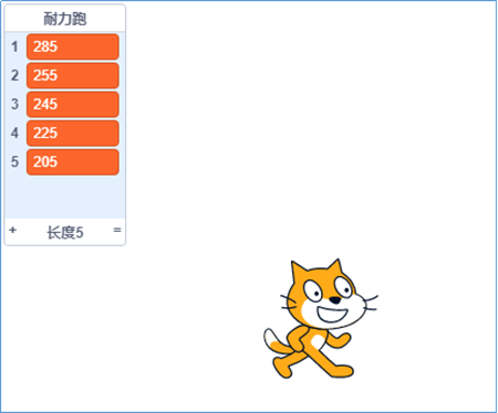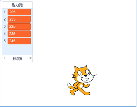 (2)点击绿旗,初始化列表,依次往列表中加入:205,255,225,285,245;