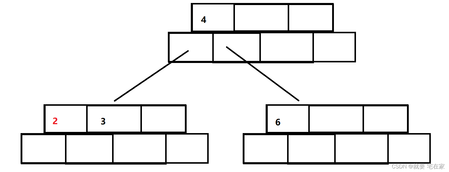 分裂:节点对半分裂,将4提出作为父节点(根节点),3和6叶子节点分别作为4的左右孩子节点