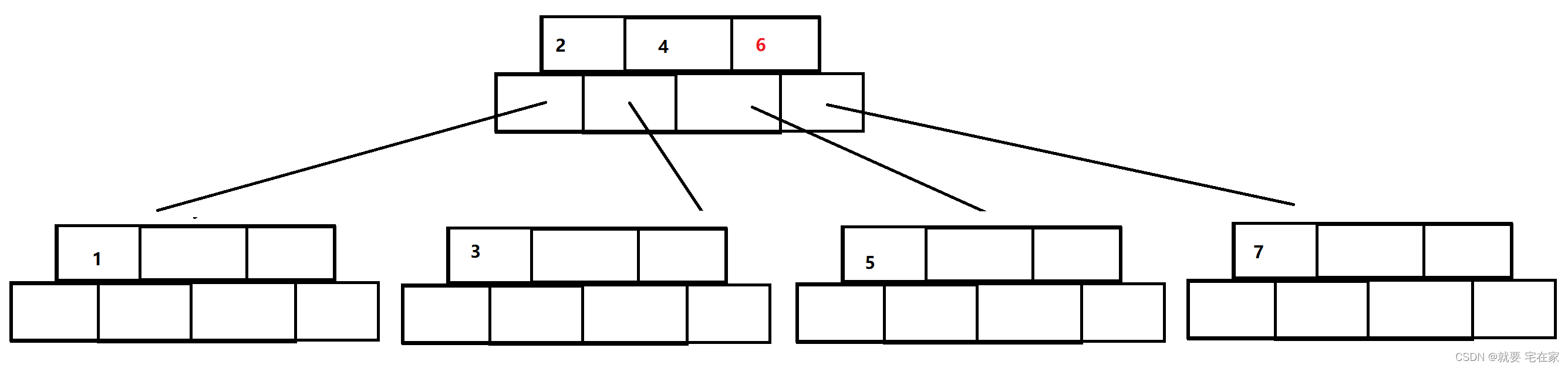 以插入3、6、4、2、7、1、5为例,假定m为3,即每个节点最多存2个元素