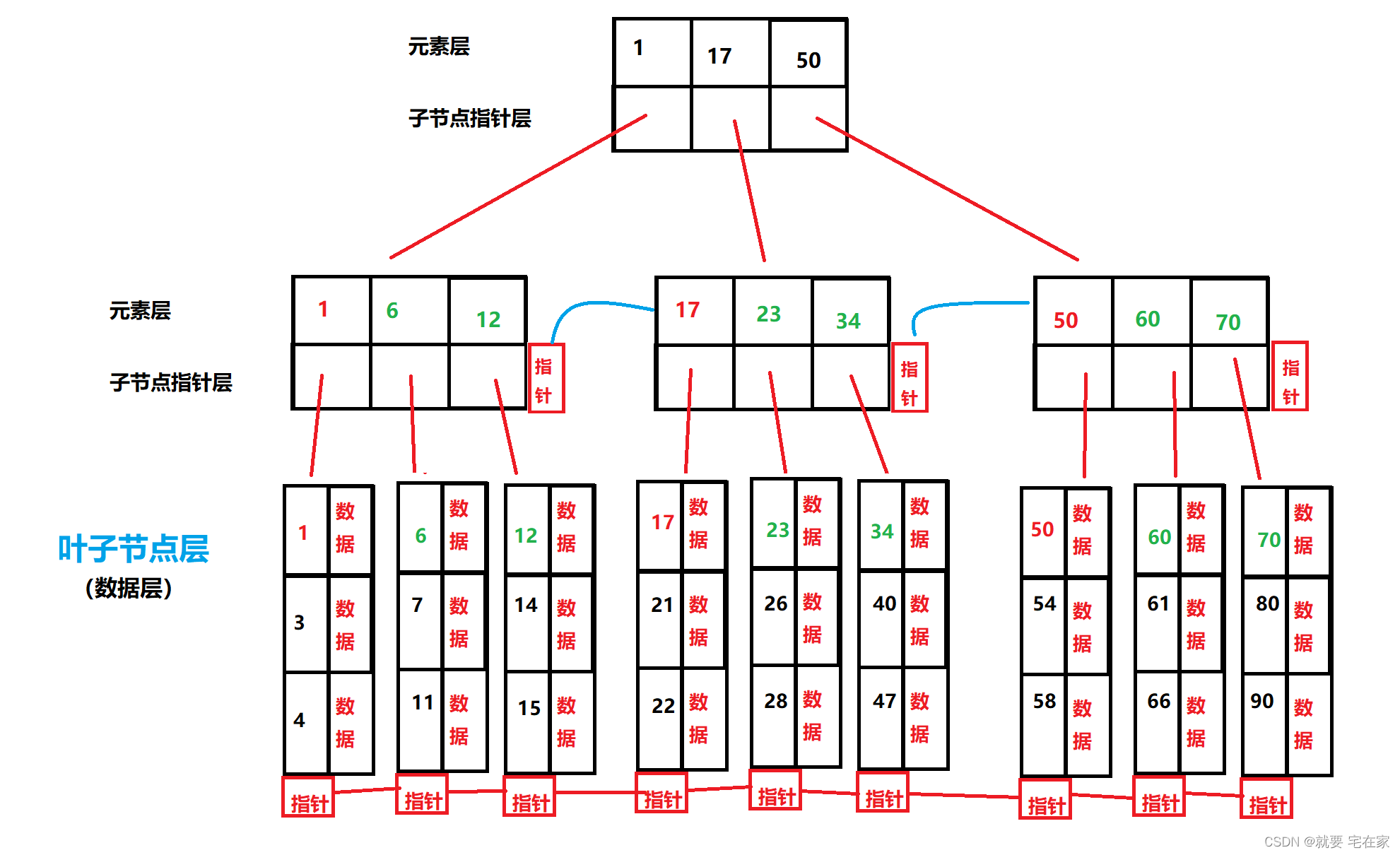 3. 所有元素都在叶子节点出现,且链表中的节点都是有序的