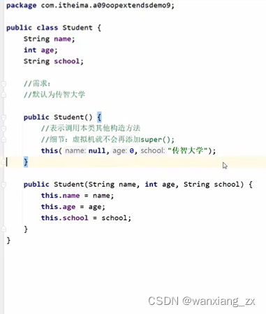 例如给所有没传递参数的学生默认为“传智大学” ,便可在空参构造的第一行这样写。
