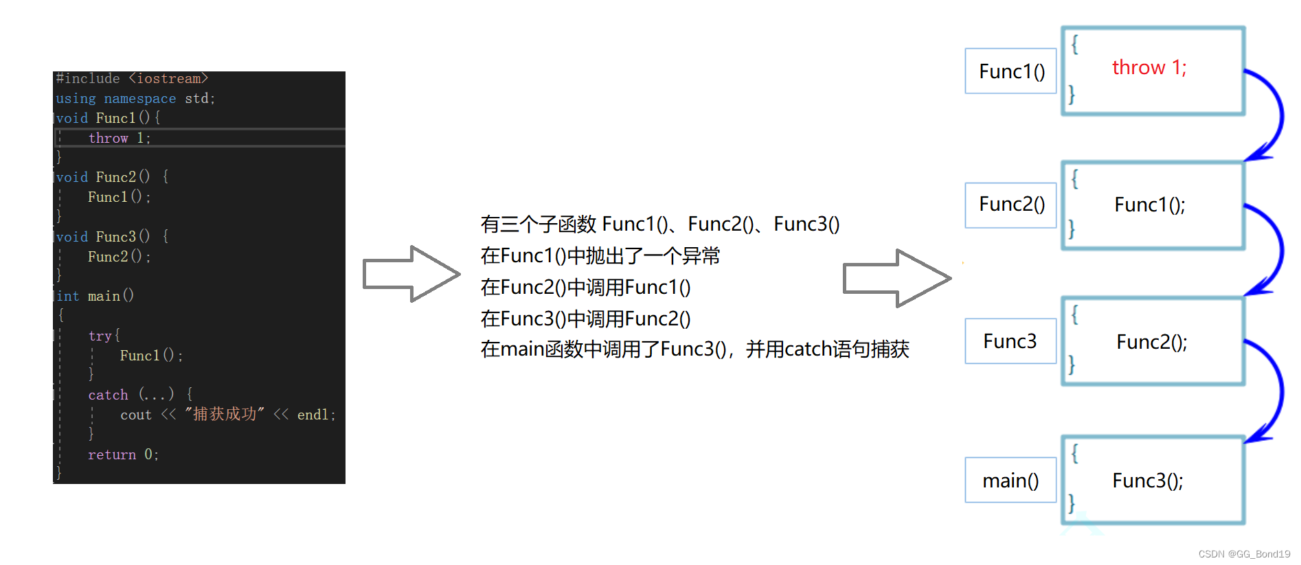 3. 抛出异常对象后,会生成一个异常对象的拷贝。因为抛出的异常对象可能是一个临时对象,所以会生成一个拷贝对象,这个拷贝的临时对象会在被catch以后销毁。(这里的处理类似于函数的传值返回)