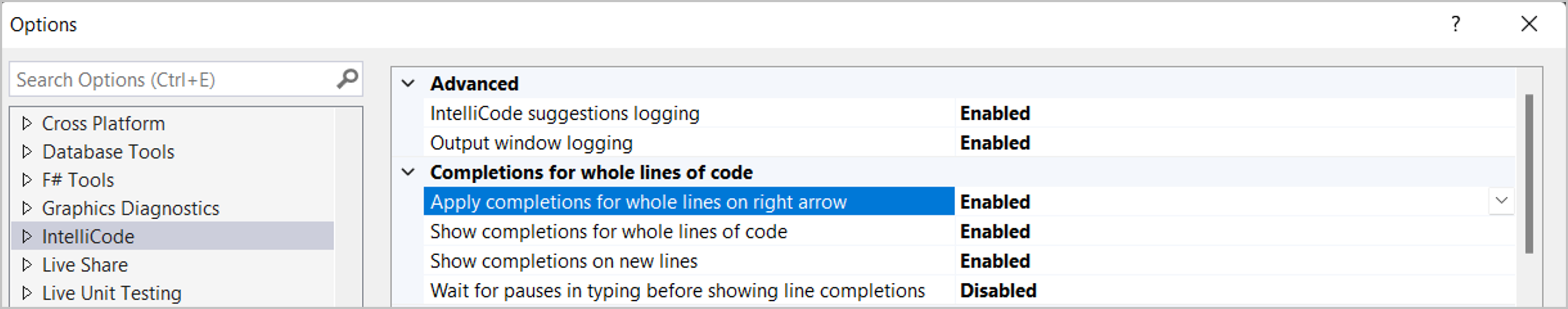 默认情况下,Tab 键用于接受整行完成。 若要更改默认接受键,请对整行代码选择“工具”->“选项”->“IntelliCode”->“完成”。 启用名为 Apply completions for whole lines on right arrow 的设置。