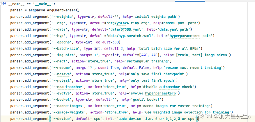 parser.add_argument('--cfg', type=str, default='cfg/csdarknet53s-BIFPN-spp-CA-GTSDB.cfg', help='model.yaml path')parser.add_argument('--data', type=str, default='data/GTSDB.yaml', help='data.yaml path')