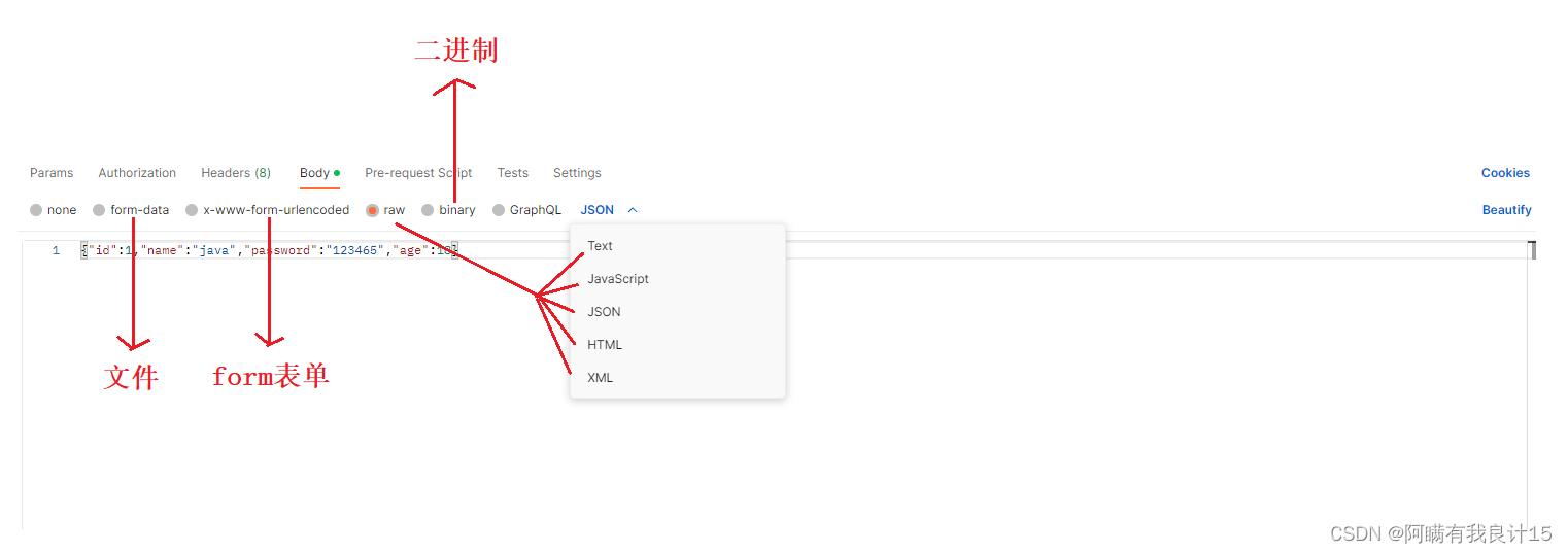 我们看看postman传递参数的方法有哪些?(用户可以通过文件,form表单,raw,binary等方式,将参数,传递给Java后端程序)