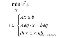 注意后面的参数可以省略,中间如果有条件用不到,需要用[]占位将以上字母按照matlab标准形式带入[x,fval]=lingrog(c,A,b,Aeq,Beq,lb,ub)