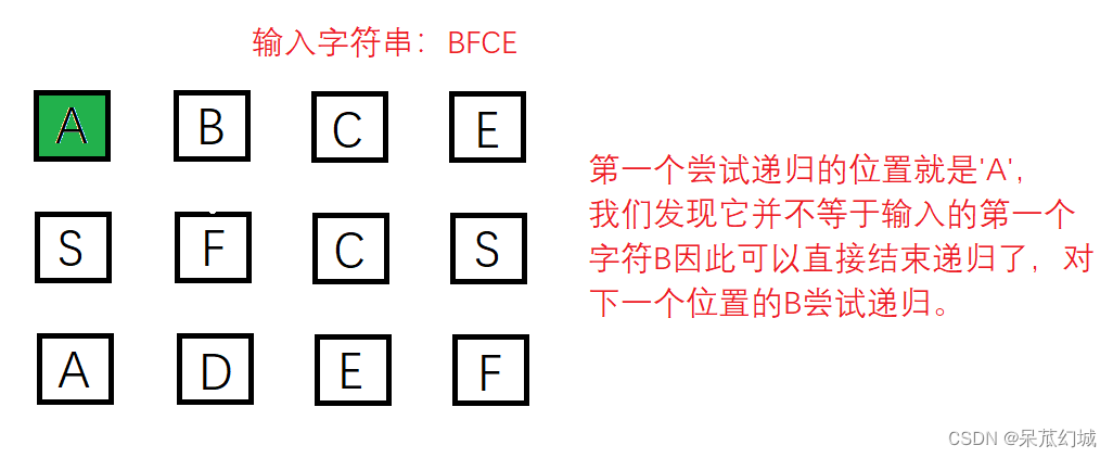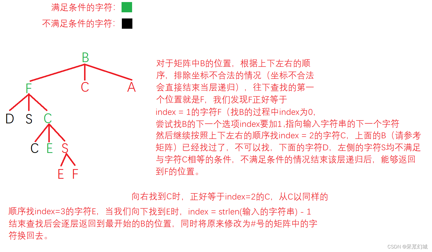 对于上述例子,遍历输入字符串的下标变量不妨设为index,初始时index为0,对应输入的字符B,当我们尝试递归B这个位置时,他与index指向的字符相等,我们就让下一层递归时index的值加1指向下一个查找的字符,即尝试去找到 F这个字符。