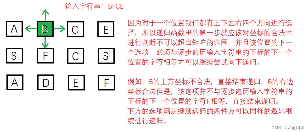 首先我们需要遍历输入的矩阵,把每一个下标的位置都作为一次递归的起点,尝试往下递归。这时在递归函数的内部我们就需要对进入递归函数的下标做合法性判断,并且与输入字符串的第一个字符进行比较,若与字符串的第一个字符相等,我们就找到了可以继续往下递归的位置啦。为此在递归函数的参数上需要一个下标变量,能够在递归的过程中,逐步遍历到输入字符串的每一个字符。(找到解题路径的依据就是匹配到输入字符串的每一个字符嘛)