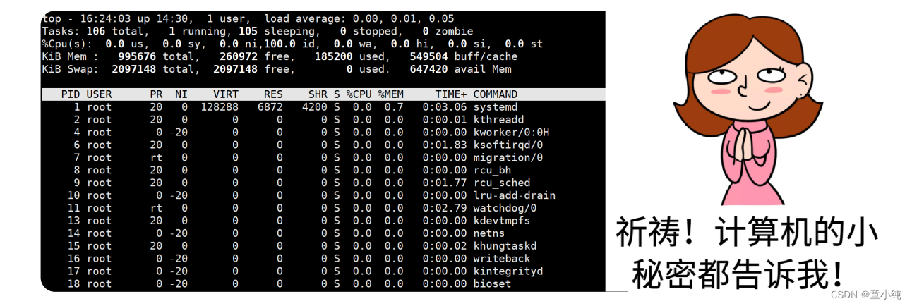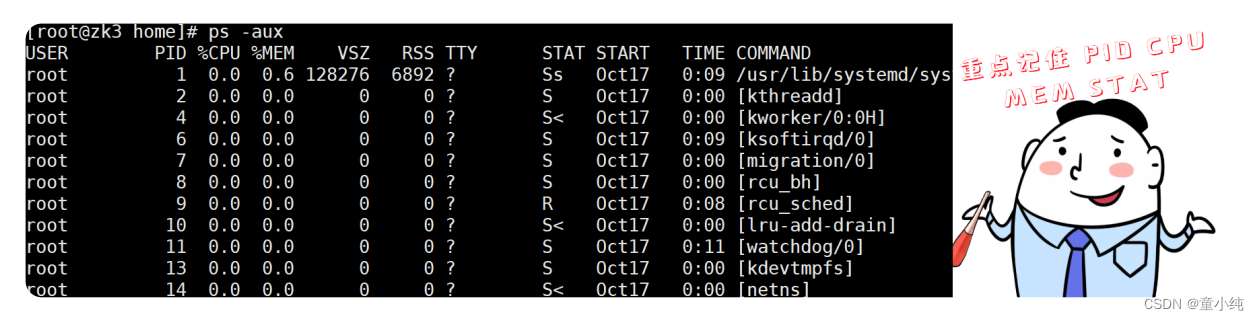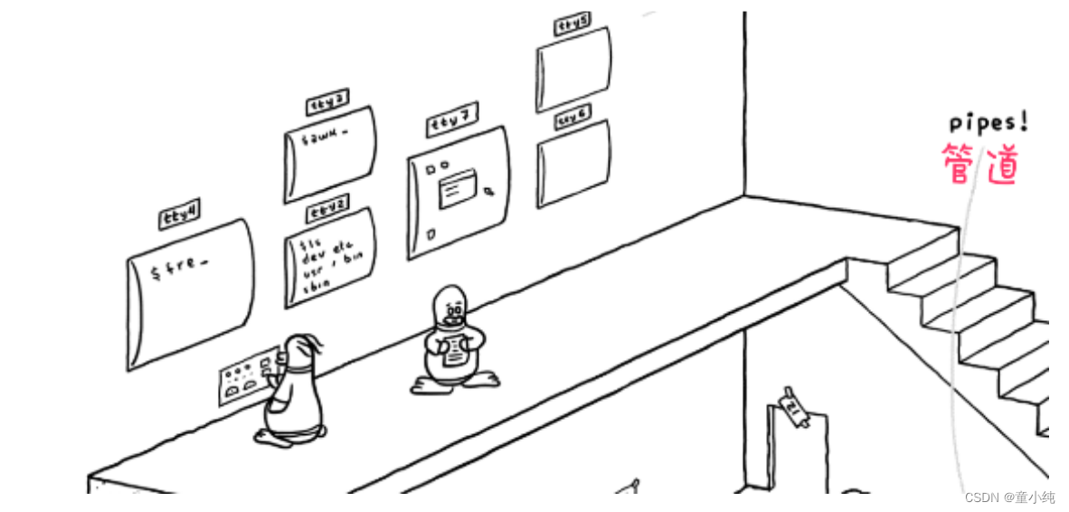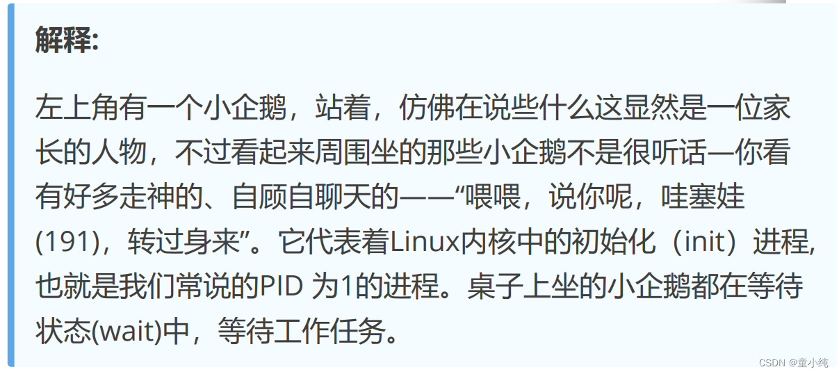 地基(底层)由一排排的文件柜组成,然有序,文件柜里放置 着“文件”—电脑中的文件。左上角,有一只胸前挂着421号牌的 小企鹅,它表示着PID (进程ID(Process ID) )为421的进程、它正在查看文件柜中的文件,这代表系统中正有一个进程在访问 文件系统。在右下角有一只小狗,它是看门狗(watchdog) 、这代表对文件系统的监控。
