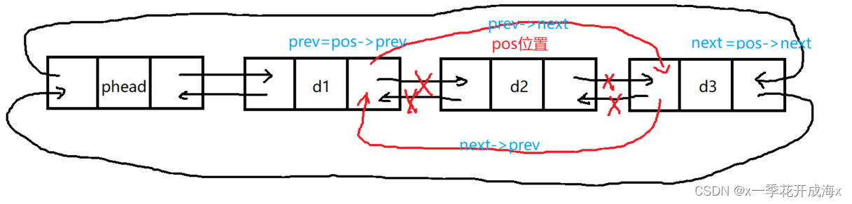 {assert(pos);LTNode* prev = pos->prev;LTNode* next = pos->next;free(pos);prev->next = next;next->prev = prev;