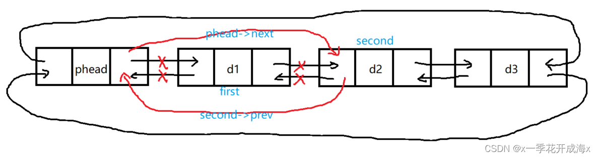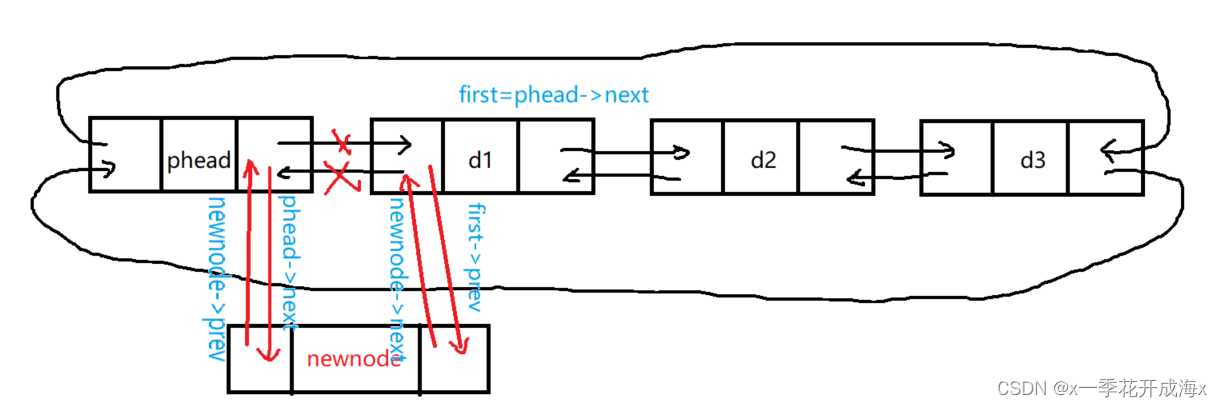 {assert(phead);LTNode* newnode = BuyListNode(x);LTNode* first = phead->next;//phead newnode first//顺序无关phead->next = newnode;newnode->prev = phead;newnode->next = first;first->prev = newnode;