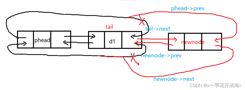 {assert(phead);LTNode* newnode = BuyListNode(x);LTNode* tail = phead->prev;tail->next = newnode;newnode->prev = tail;newnode->next = phead;phead->prev = newnode;