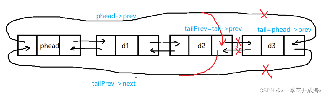{assert(phead);LTNode* tail = phead->prev;LTNode* tailPrev = tail->prev;tailPrev->next = phead;phead->prev = tailPrev;free(tail);