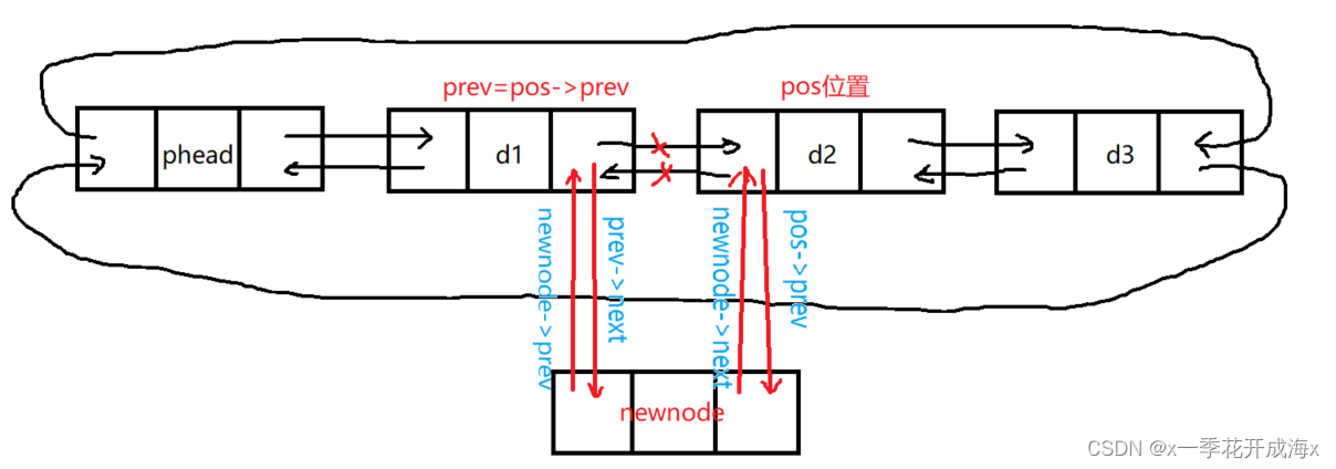 {assert(pos);LTNode* prev = pos->prev;LTNode* newnode = BuyListNode(x);//prev newnode posprev->next = newnode;newnode->prev = prev;newnode->next = pos;pos->prev = newnode;