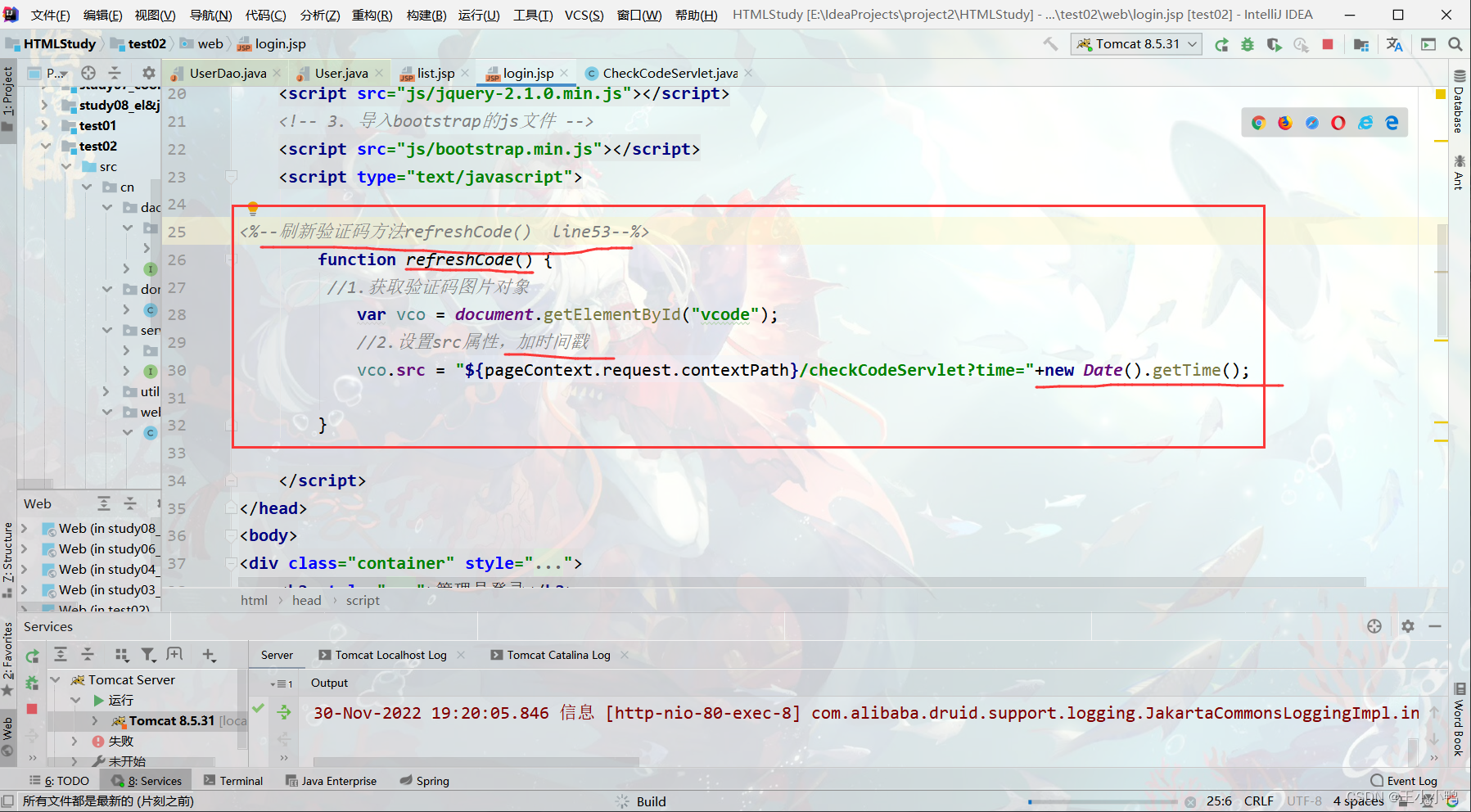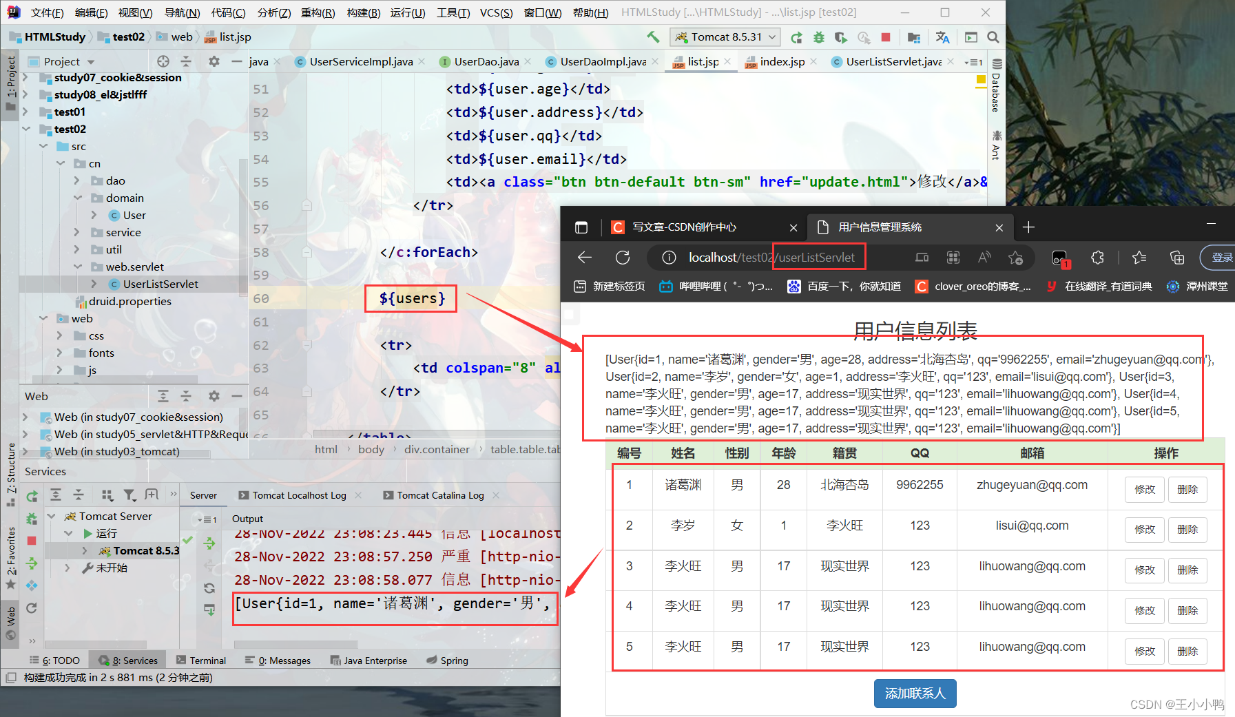 在/test02/userListServlet下可以输出,但是list.jsp下没有打印出来