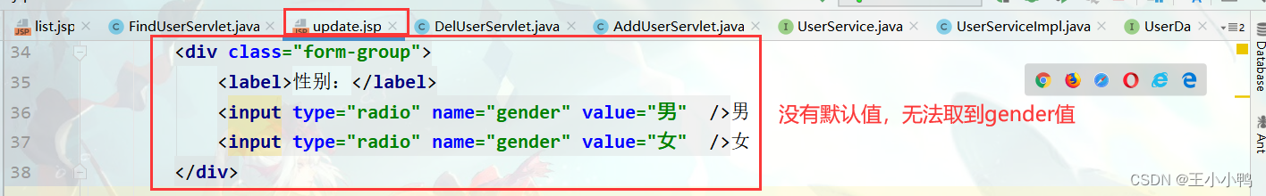 之前的修改性别和地址不知道默认值,所以要判断选择框里的性别和籍贯,需要在update.jsp开头加上标签引入