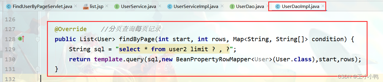 //1.设置编码request.setCharacterEncoding("utf-8");//2.获取参数Mapmap = request.getParameterMap();//3.封装对象User user = new User();try {BeanUtils.populate(user,map);} catch (IllegalAccessException e) {e.printStackTrace();} catch (InvocationTargetException e) {e.printStackTrace();}//4.调用service方法报错UserService service = new UserServiceImpl();service.addUser(user);//5.跳转到/userListServlet // 没有共享数据使用重定向 加上虚拟路径request.getContextPath()response.sendRedirect(request.getContextPath()+"/userListServlet"); UserDaoImpl中的addUser方法也优化了@Overridepublic User addUser(User user) {try {//第一版 //String sql = "insert into user2 set name = ?, gender = ?, age = ?, address = ?, qq= ?, email = ?";//第二版String sql ="insert into user2 values(null, ?, ?, ?, ?, ?, ?,null, null )";template.update(sql, user.getName(), user.getGender(), user.getAge(), user.getAddress(), user.getQq(), user.getEmail());} catch (DataAccessException e) {e.printStackTrace();}return user;}添加用户成功!