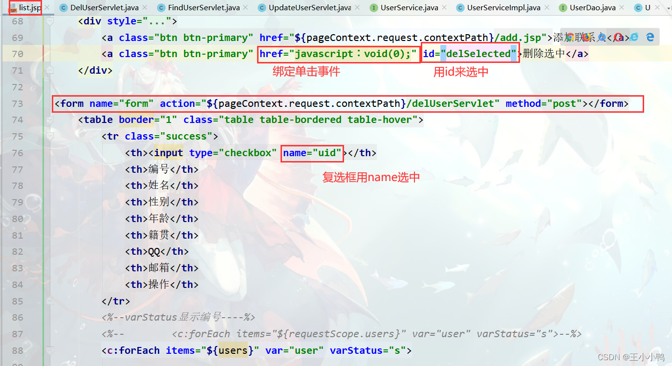 // 因为是根据id删除,不涉及汉字,可以不用设置编码// 1.获取id对象String id = request.getParameter("id"); // 2.调用service删除UserService service = new UserServiceImpl();service.deleteUser(id); //3.跳转查询所有servleresponse.sendRedirect(request.getContextPath()+"/userListServlet");测试: