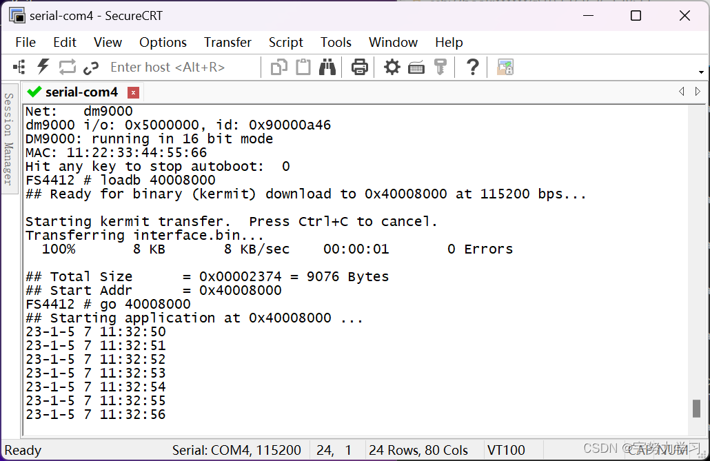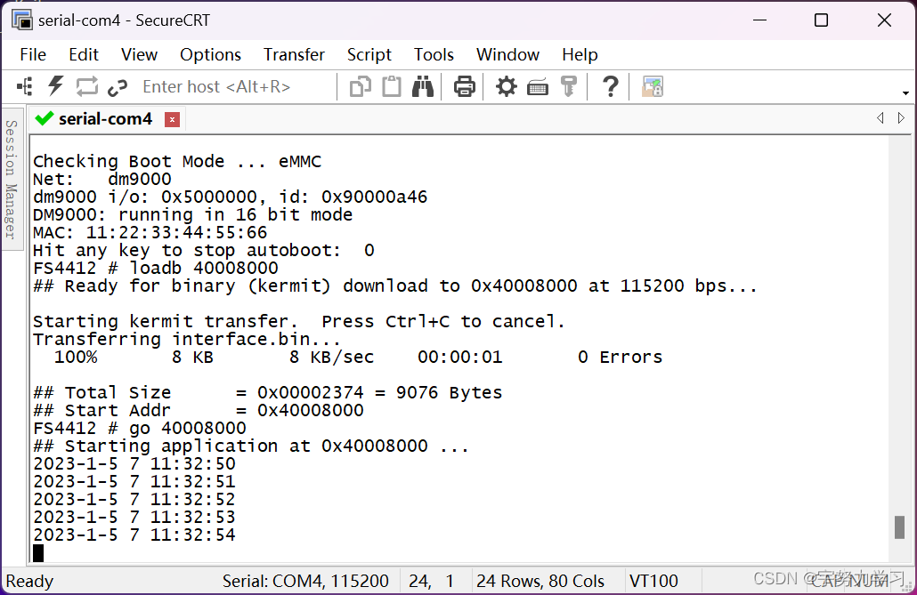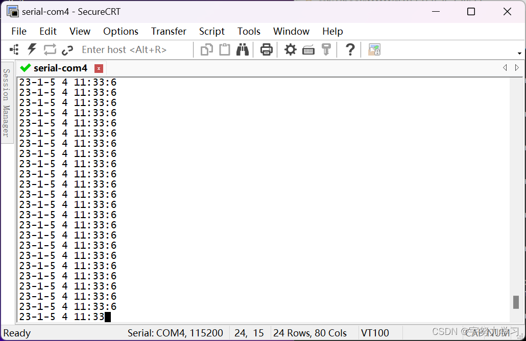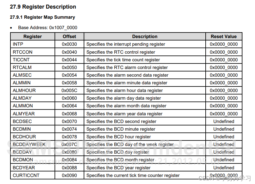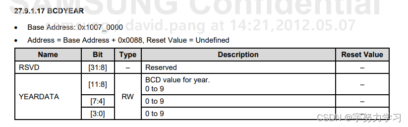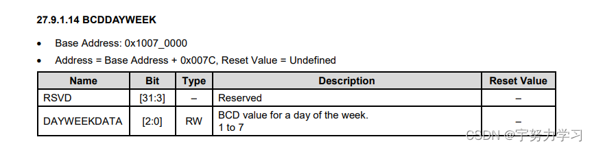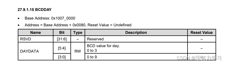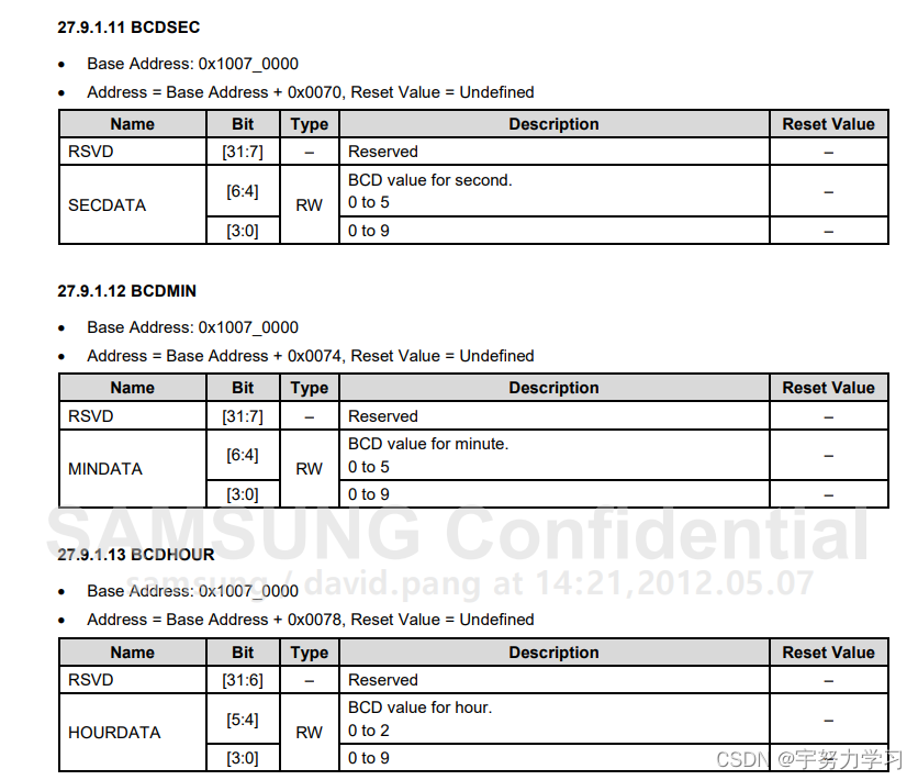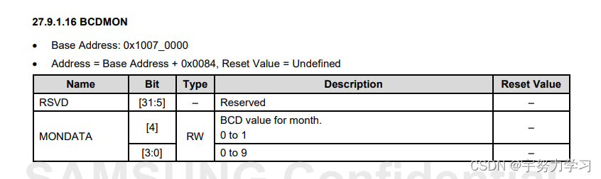 {//使能RTC控制RTCCON = RTCCON | 1;//校准时间RTC.BCDYEAR = 0x023; //000000100011 2023RTC.BCDMON = 0x1; //1RTC.BCDDAY = 0x5; //5RTC.BCDWEEK = 0x4; //星期四RTC.BCDHOUR = 0x11; //11RTC.BCDMIN = 0x32; //32RTC.BCDSEC = 0x50; //50s//关闭RTC控制RTCCON = RTCCON & 0;while(1){printf("%x-%x-%x %x %x:%x:%x\n",RTC.BCDYEAR,RTC.BCDMON,RTC.BCDDAY,RTC.BCDWEEK,RTC.BCDHOUR,RTC.BCDMIN,RTC.BCDSEC);}return 0;