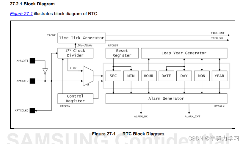 32.768KHz的时钟 经过一个2^15的分频器(32768)就获得了一个1Hz的时钟,来给秒使用