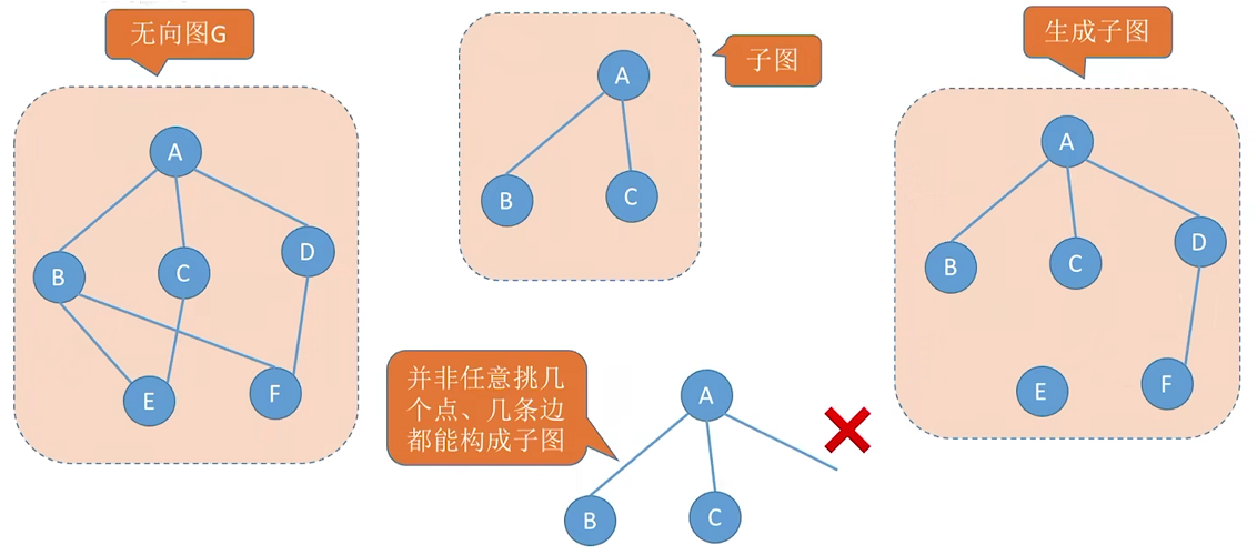 设有两个图 G= (V,E) 和 G'= (V',E'),若 V' 是 V 的子集,且 E' 是 E 的子集,则称 G '是 G 的子图。(注意图,中边一定是依附于顶点的)