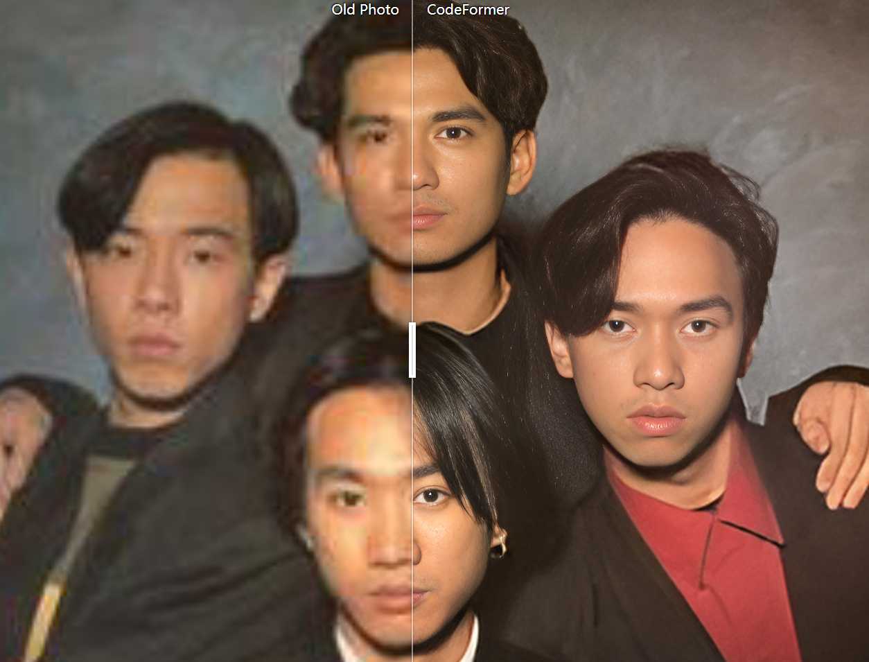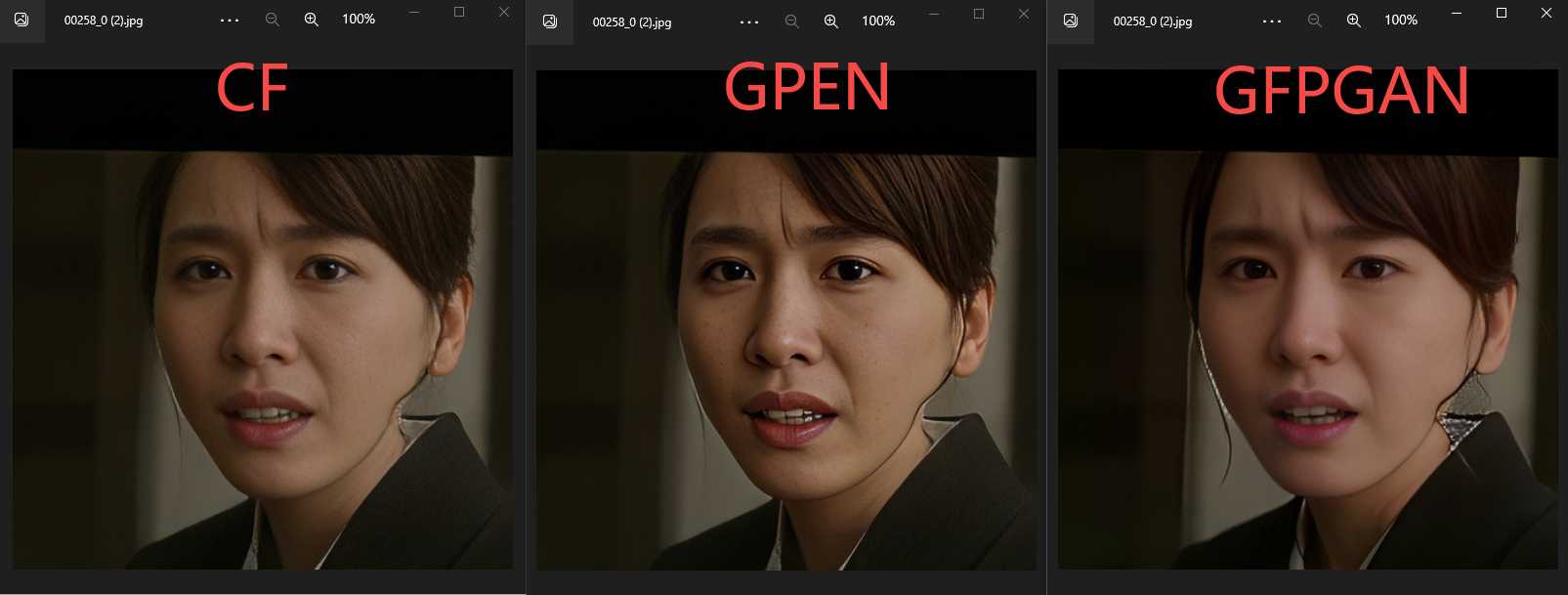 正面效果上,codeFormer(以下简称CF)效果最好,清晰又清爽,原人物的身份特征保留完好