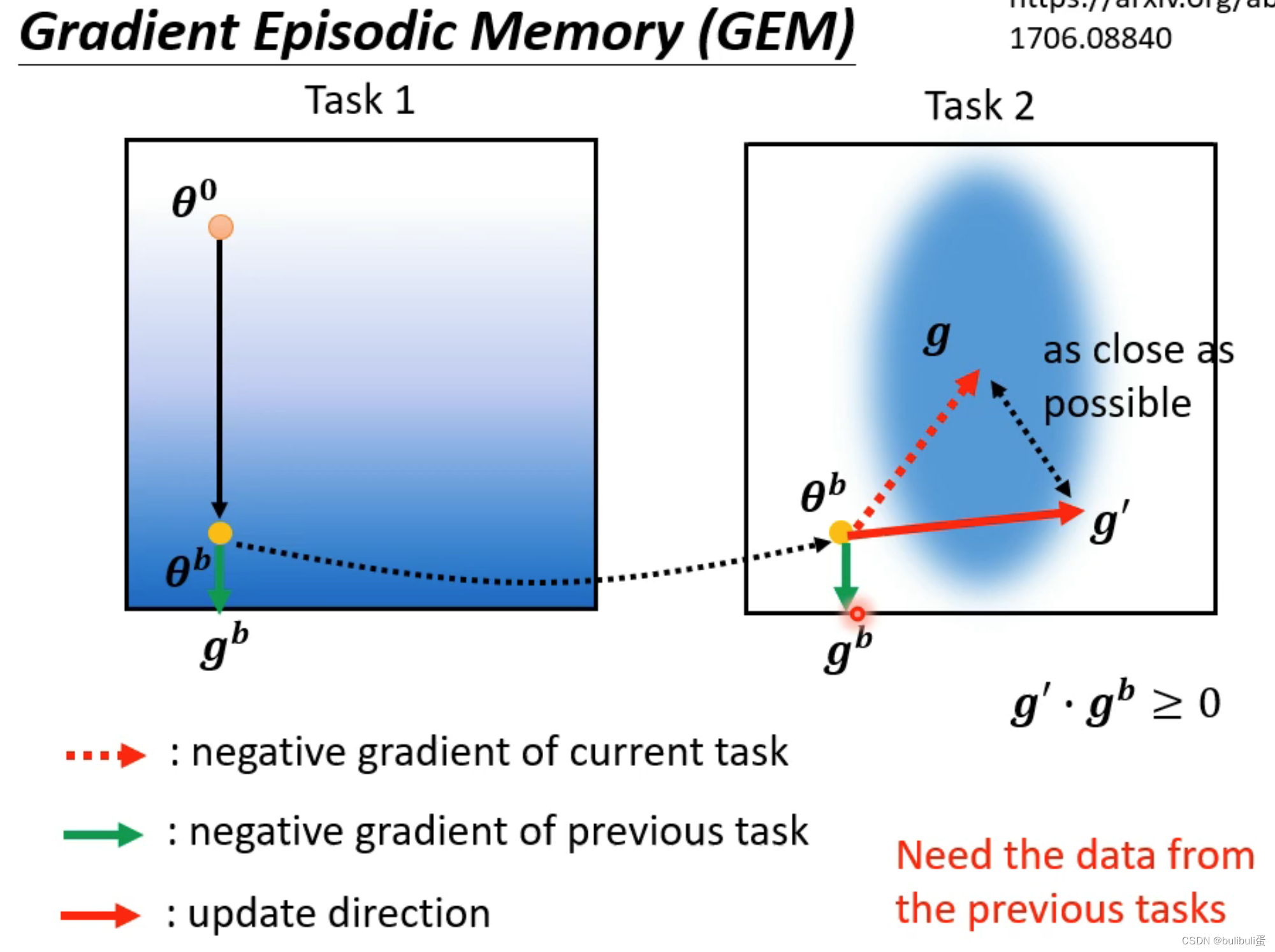 Forget的原因:白色——loss越大,蓝色——loss越小,先让模型训练task1,随机训练的参数θ0,然后使用梯度下降的方法调整θ0的参数,得到θb。将θb的参数迁移到Task2,继续训练得到θ*。将θ*应用于task1发现loss变大,说明出现了forget现象。如果将θb往右移是否在task1上效果更好呢?(往右移也是蓝色区域)