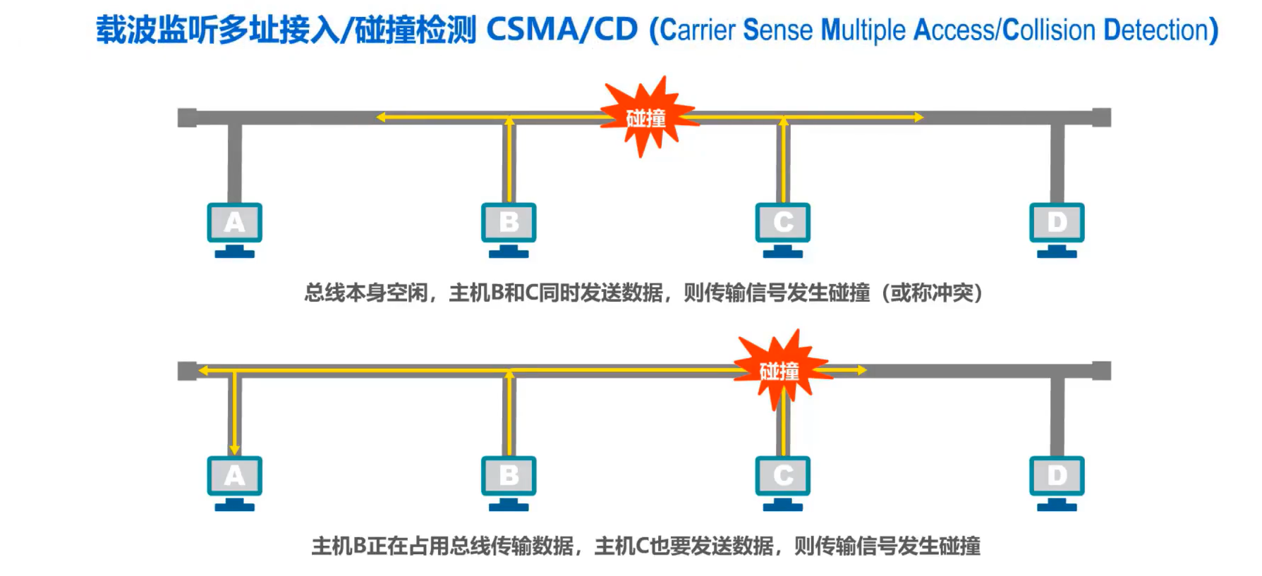 引出问题: 主机A和主机C同时使用总线来发送数据,这必然会造成信号碰撞。