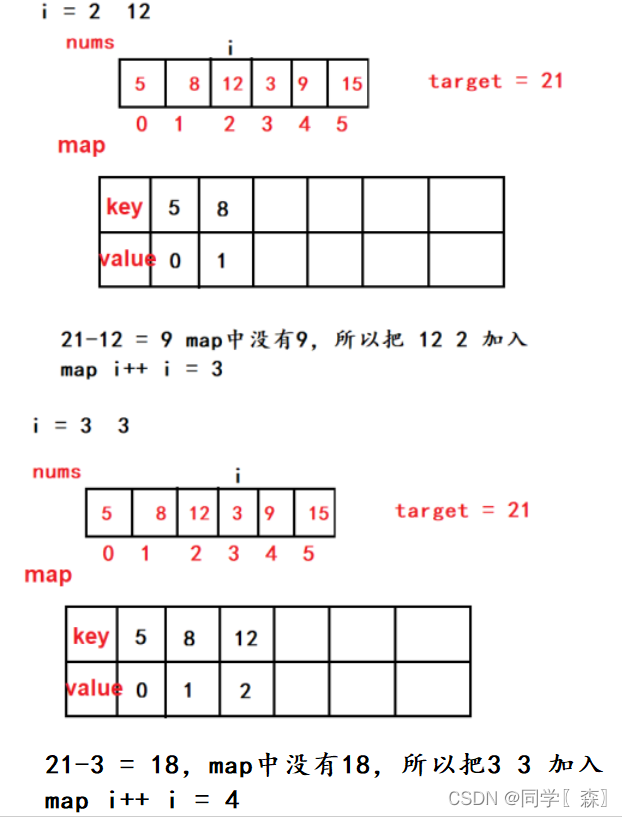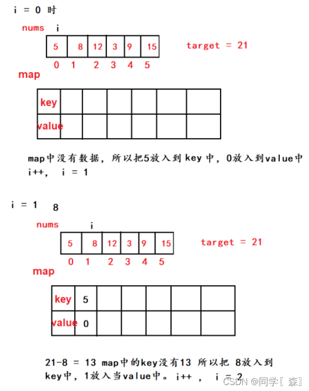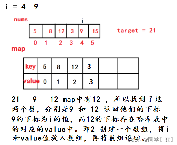class Solution {public int[] twoSum(int[] nums, int target) {Map map = new HashMap();//创建哈希表for(int i = 0; i < nums.length; i++) {if(map.containsKey(target - nums[i]) ) {//判断是否在哈希表中存在第二个数,由原来的循环变成了判断。//时间复杂度降低,空间复杂度提高。用空间换取时间。return new int[] {map.get(target - nums[i]), i}; //注意返回顺序,i在后面,后返回}map.put(nums[i], i); //将数组的值和下标存放进哈希表。}return new int[] {0};}