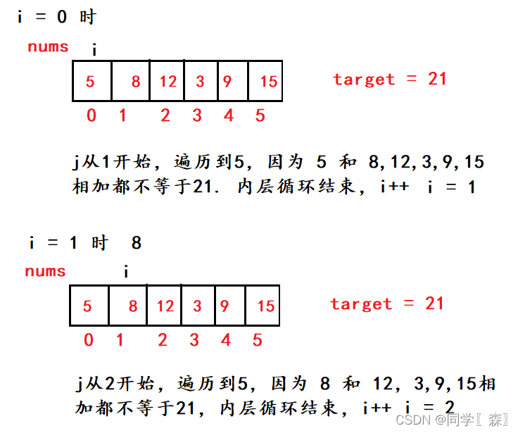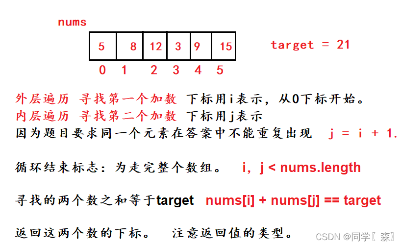 class Solution {public int[] twoSum(int[] nums, int target) {int len = nums.length;for(int i = 0; i < len; i++) {//外层循环,确定第一个加数for(int j = i + 1; j < len; j++){//内层循环,确定第二个加数if(target == nums[i] + nums[j]) {//判断条件return new int[] {i, j}; // 返回的下标放进数组中}}}return new int[] {0};}