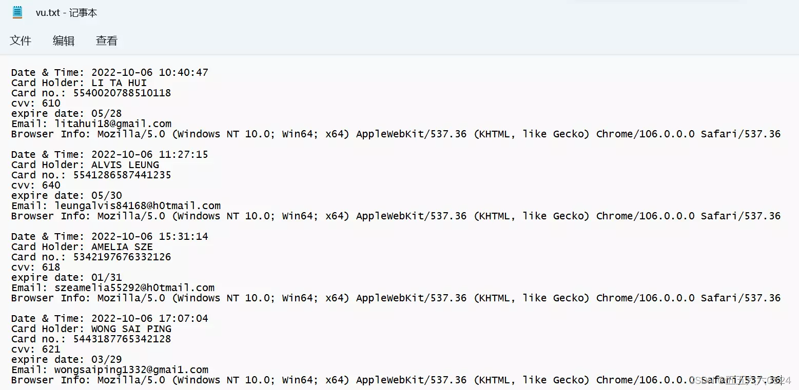 查看vu.txt中已经收集到的信息,会收集受害人输入数据的时间、持卡人姓名、信用卡号码、信用卡安全码、信用卡到期时间、电邮地址、浏览器信息