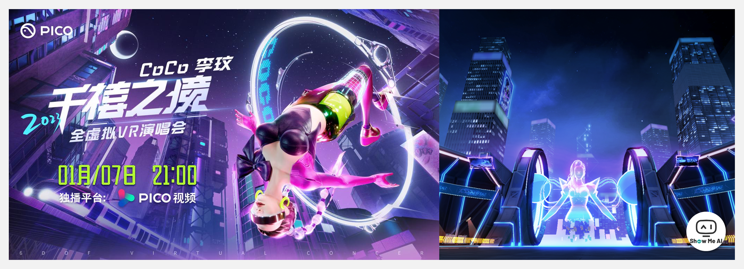 1月7日21:00《李玟“千禧之境”全虚拟VR演唱会》即将上线 PICO 视频。这是国内首场明星 6DoF 全虚拟VR演唱会,以搭乘时光列车穿越至千禧年代“解救”李玟为故事主线,不同风格的歌曲延展出不同的场景,从山水到星空,从落叶到飘雪,创造出独特的音乐和互动体验!