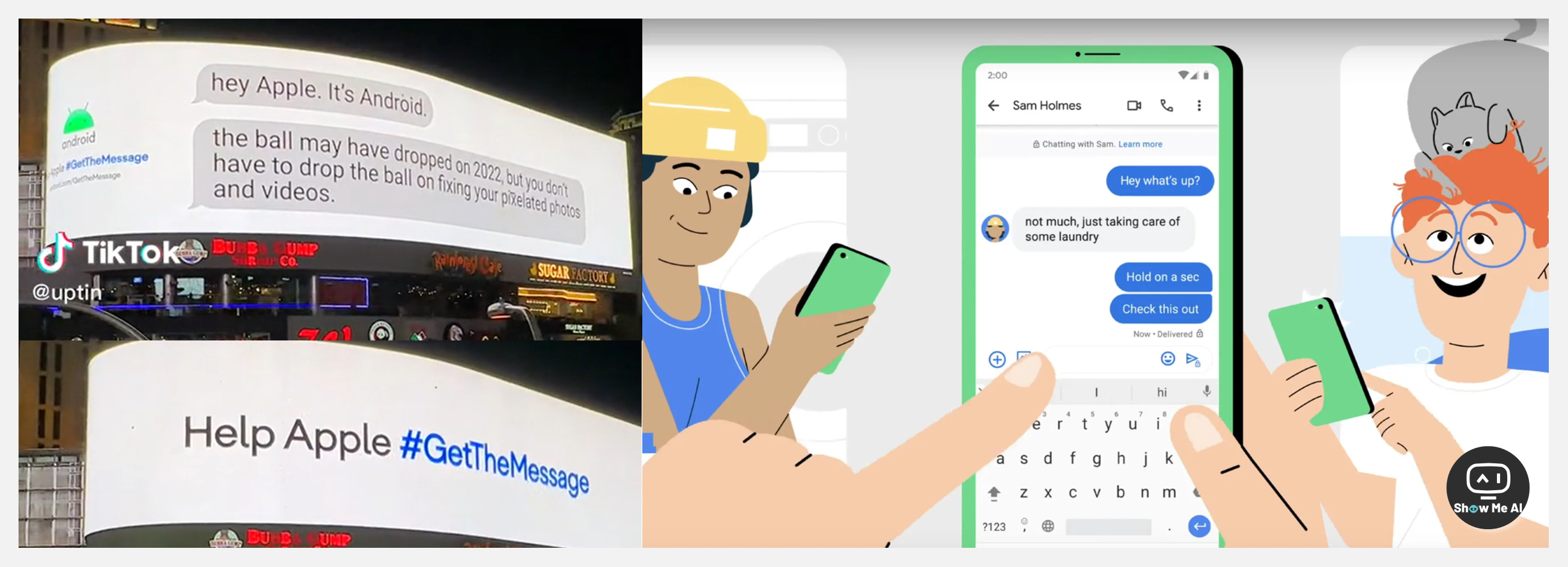 Google 早在8月就发起了 GetTheMessage 行动,通过网站、Twitter、广告牌等方式呼吁苹果采用 RCS,以支持更高分辨率的照片/视频/音频信息、更大的文件尺寸、加密改进、跨平台的表情符号、不同设备间更可靠的群聊等。但是,苹果对此反应平平,CEO库克最近更是表示,RCS不是一个优先事项。(来源:Aaron)