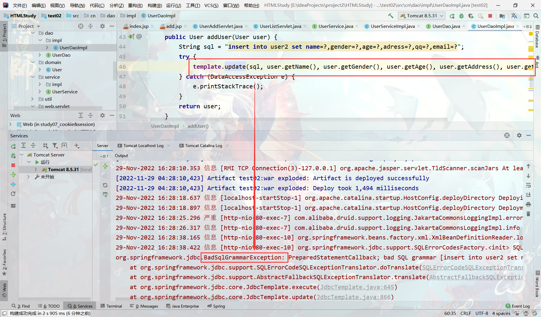 org.springframework.jdbc.BadSqlGrammarException: PreparedStatementCallback; bad SQL grammar [insert into user2 set name=?,gender=?,age=?,adress=?,qq=?,email=?]; nested exception is java.sql.SQLSyntaxErrorException: Unknown column 'adress' in 'field list'
