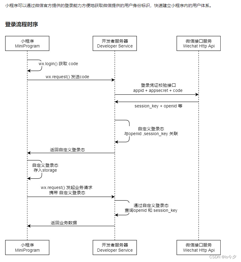 注意: session_key 是对用户数据进行 加密签名 的密钥。为了应用自身的数据安全,开发者服务器不应该把会话密钥下发到小程序,也不应该对外提供这个密钥。