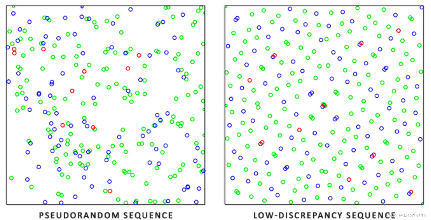 使用伪随机数产生随机采样会造成方向分布不均匀,因为伪随机数之间并不了解彼此的信息,可能会产生丛聚,这会导致蒙特卡罗积分方程式中,预估的准确性较差,收敛速度慢。通过使用低差异序列替换伪随机数,我们可以提高准确度,它本质上可以更好地保证分配的方向。使用Low-Discrepancy Sequence来生成蒙特卡罗采样向量,这个过程被称为Quasi-Monte Carlo积分。Quasi-Monte Carlo方法有更快的收敛速度,使他能够胜任大型复杂的应用。