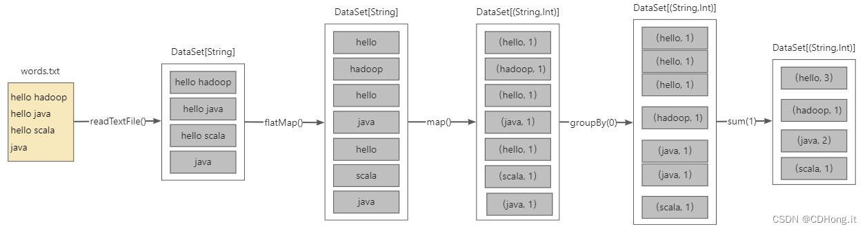 使用Flink Scala完成批处理的词频统计案例,具体处理流程如下: