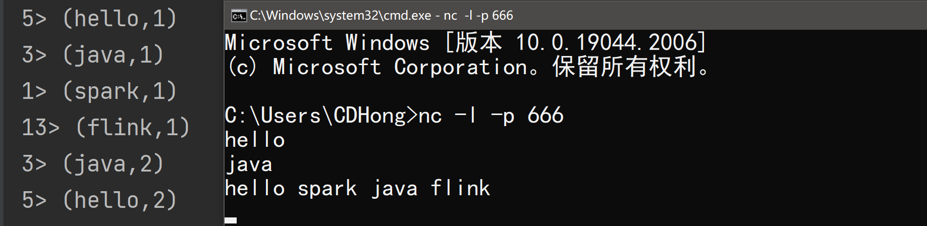 import org.apache.flink.streaming.api.scala._object StreamWordCount {def main(args: Array[String]): Unit = {// 获取Flink流处理环境val env = StreamExecutionEnvironment.getExecutionEnvironment// 数据源-监控Netcat数据端口666val data = env.socketTextStream("localhost", 666)// 数据转换val result = data.flatMap(_.split(" ")).filter(_.nonEmpty).map((_,1)).keyBy(_._1).sum(1)// Sink 数据输出到控制台result.print()// 流处理环境执行env.execute()}