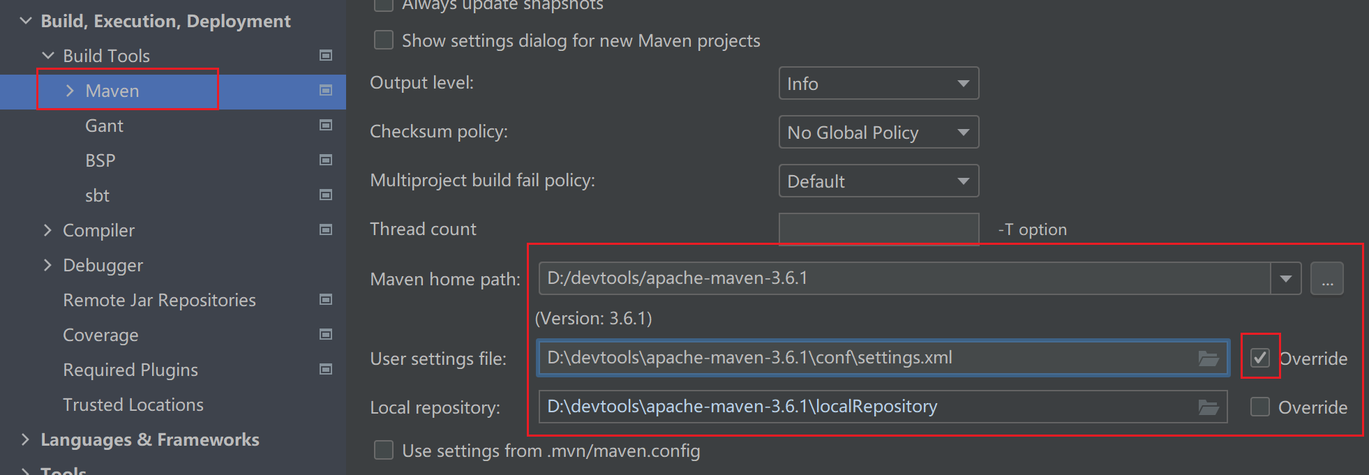 在IDEA的设置中,搜索maven,做如下修改,选择本地安装的Maven相关选项。