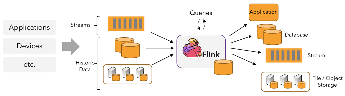 Flink 应用程序可以消费来自消息队列或分布式日志这类流式数据源(例如 Apache Kafka 或 Kinesis)的实时数据,也可以从各种的数据源中消费有界的历史数据。同样,Flink 应用程序生成的结果流也可以发送到各种数据汇中。